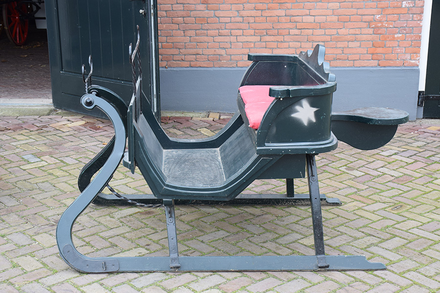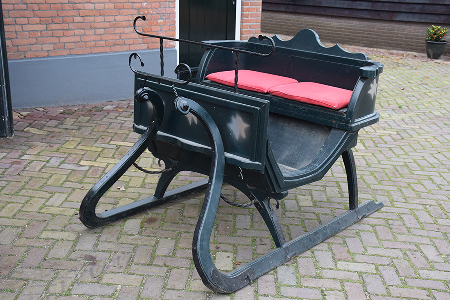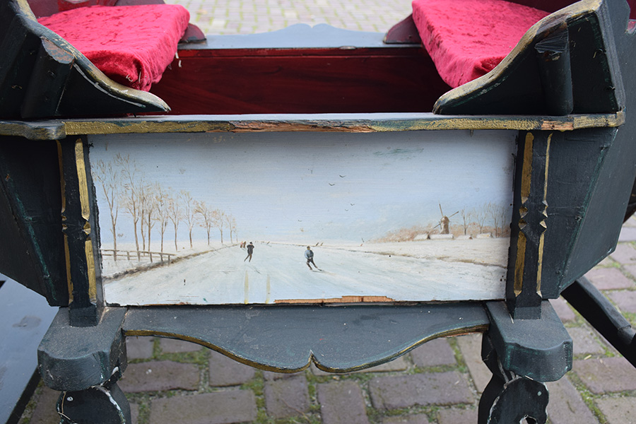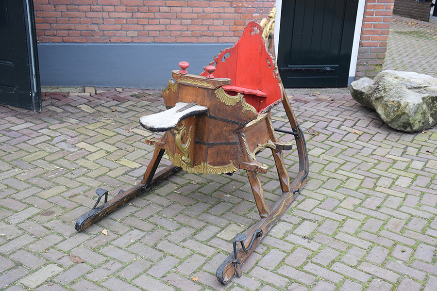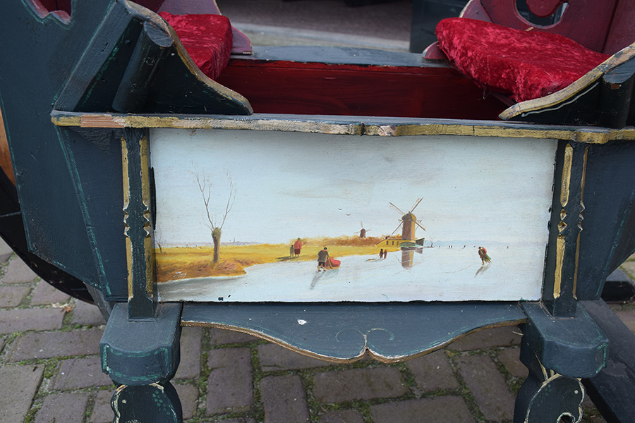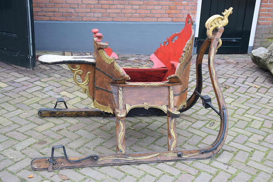 Rijkelijk gedecoreerde barokslede op ijzers (zonder stokken). Voorzien van fraaie schilderingen en prachtig houtsnijwerk. Blikvanger is het beeldje voorop van een vrouw met ontblote borst en een hond aan haar zij. Vraagprijs: € 860,-