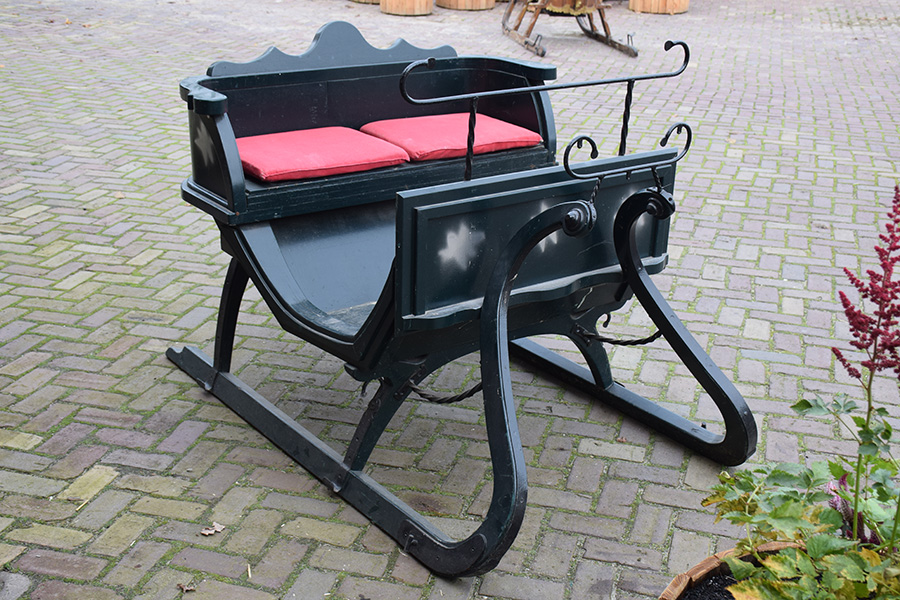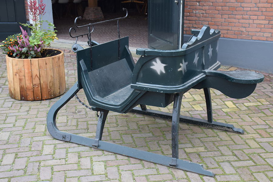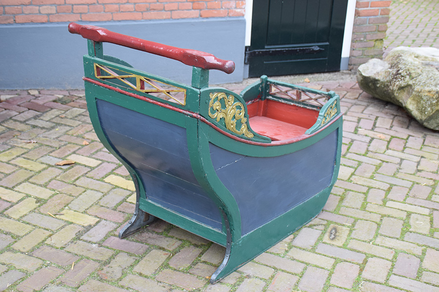 In zeer goede staat verkerende kinderduwslede uit Zuid-Holland. Geschikt voor op het ijs. Je kunt de slede zelf, al schaatsend erachter, voortduwen. Vraagprijs: € 320,-