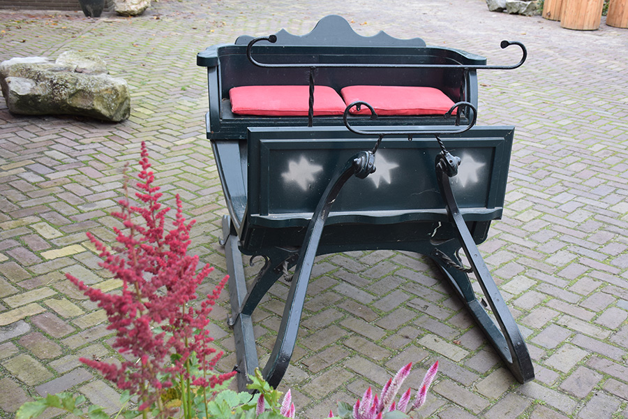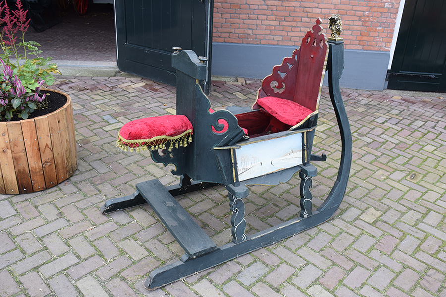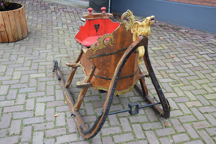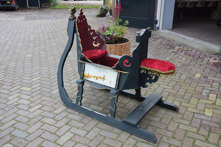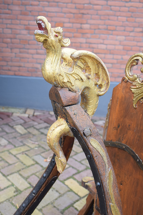 Friese arretikker uit ±1920 met zeer fraai houtsnijwerk. Staat op ijzers en wordt geleverd zonder stokken. Op de voorzijde pronkt een houten draak. Vraagprijs: € 860,-