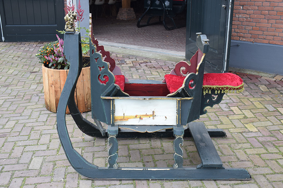 Fraaie houten arrenslede met prachtig schilderwerk rondom en nostalgische uitstraling. Een sfeervol decorstuk voor bijvoorbeeld een fotoreportage. Op de voorzijde pronkt een houten paardenhoofd met belletje. Ook zit een een mooie gouden boog aan de voorzijde van de slede. De slee verkeert in goede conditie. Vraagprijs: € 840,-