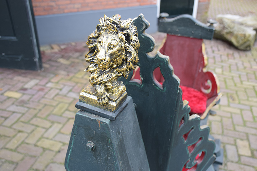 Fraaie houten arrenslee, type arretikker met mooi houtsnijwerk en sierlijk beslag. Staat op ijzers en wordt geleverd inclusief stokken. Op de voorzijde pronkt een houten leeuwtje. Vraagprijs: € 1.200,-