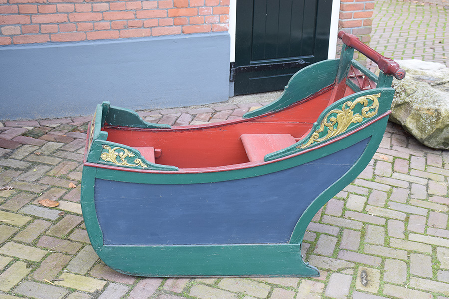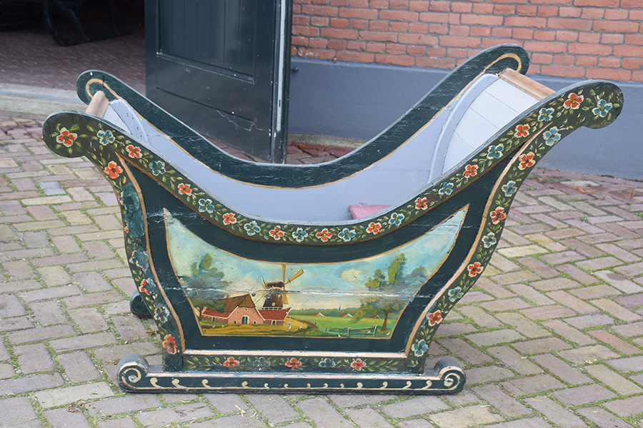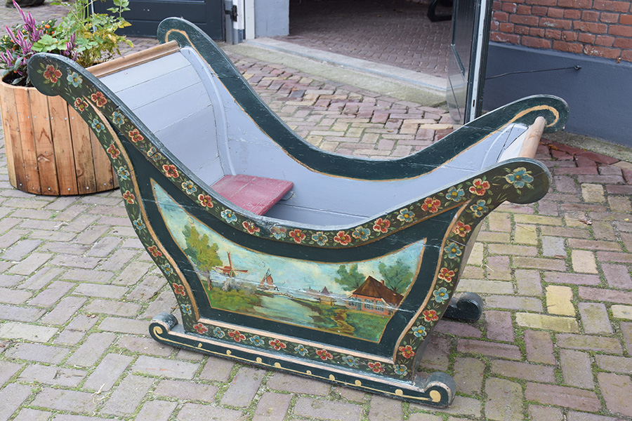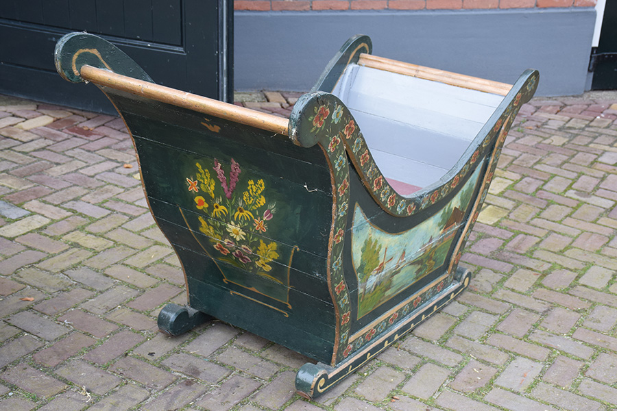 Rijkelijk versierde kinderduwslede uit Noord-Hollande met twee zomers beschilderde panelen. I.z.g.s. Geschikt voor op het ijs, geen paard ervoor, maar er zelf schaatsend achter en de slede voorduwen. Vraagprijs: € 520,-