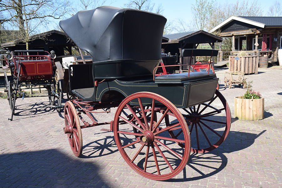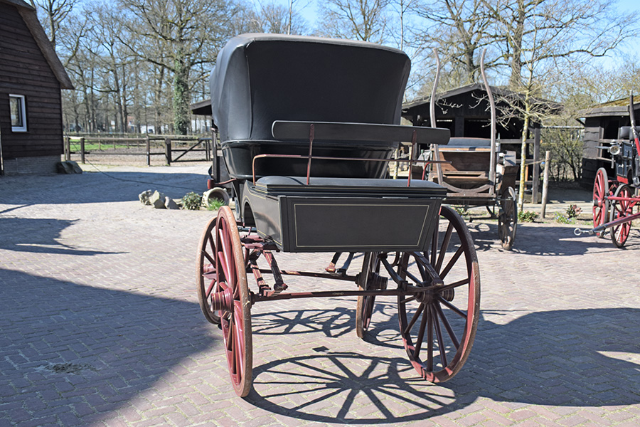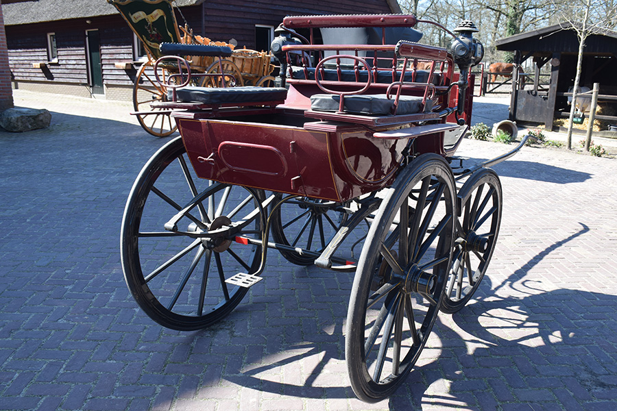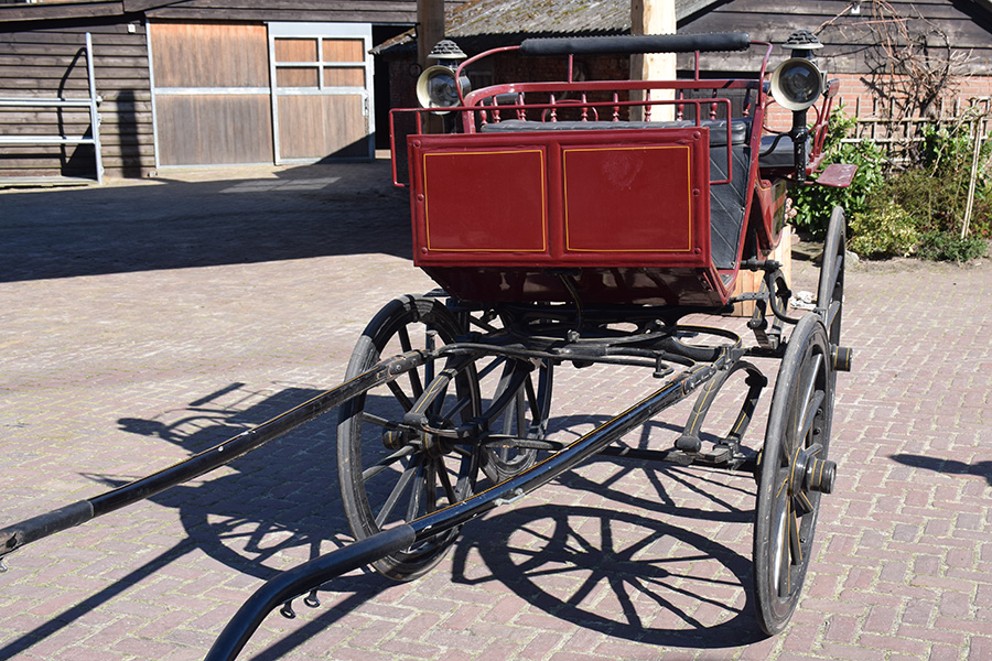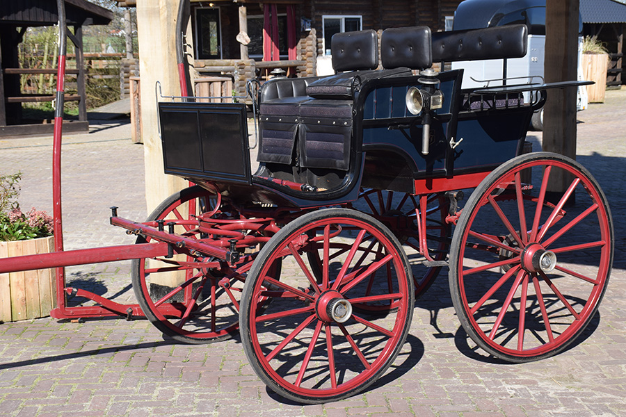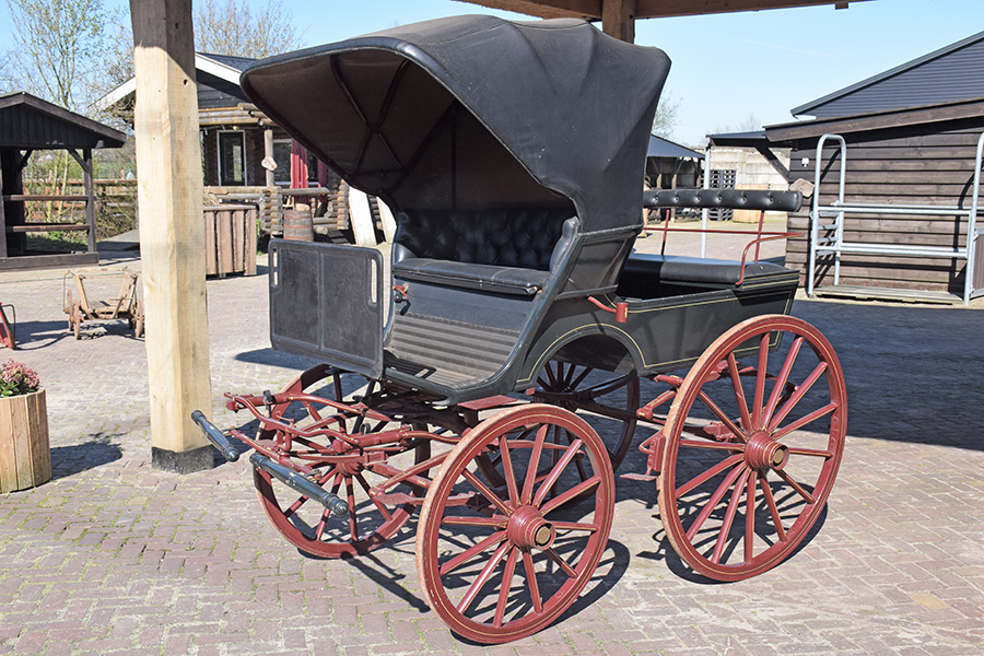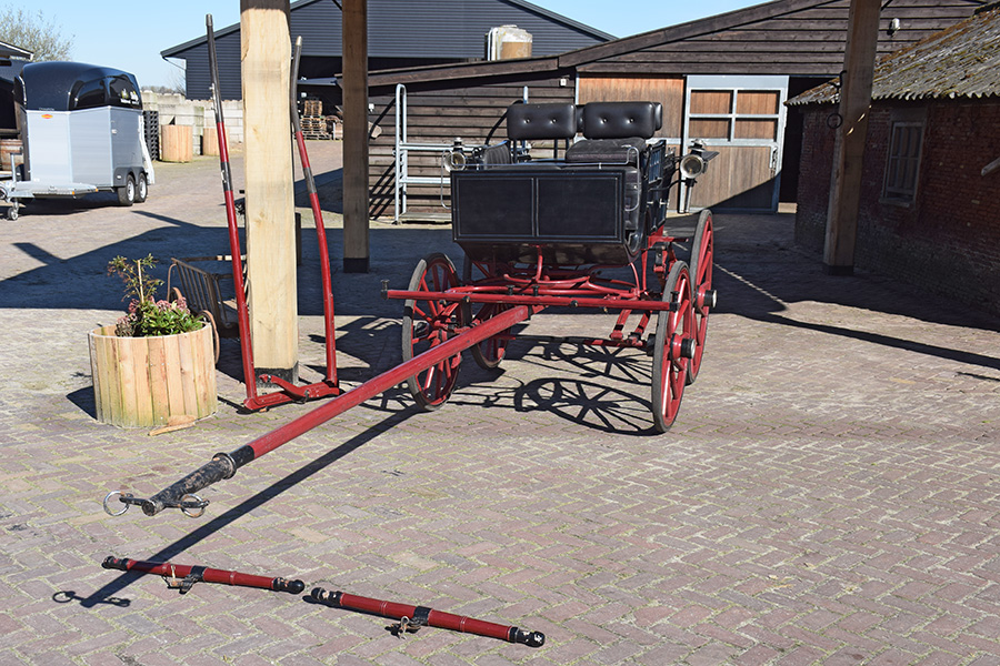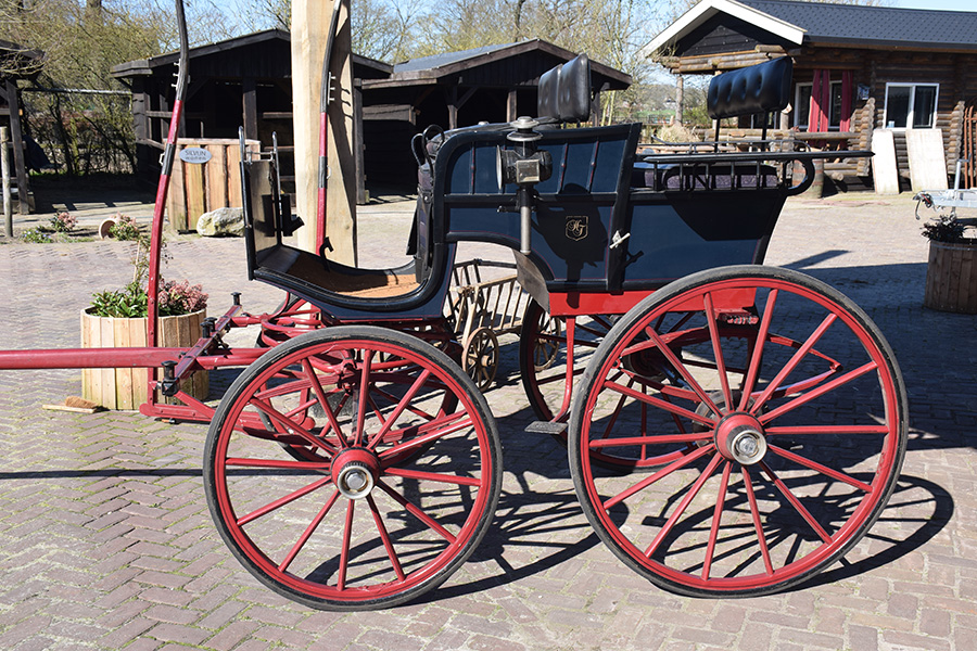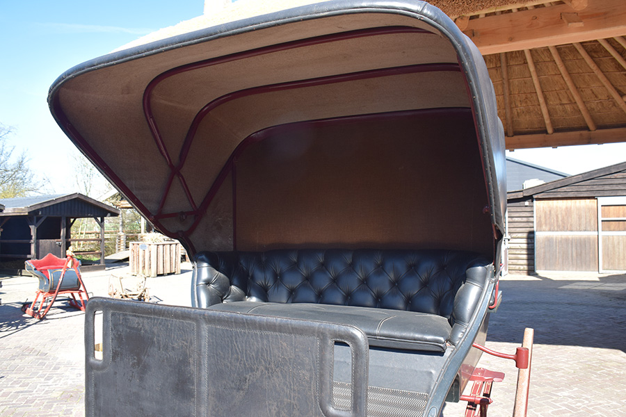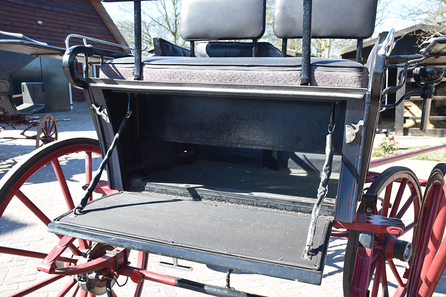 In zeer goede staat verkerende rood/zwarte open rijtuig met zwart lederen bekleding. Zowel geschikt voor enkelspan als dubbelspan, exclusief langboom. Vraagprijs: € 1.600,-