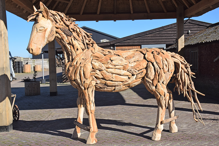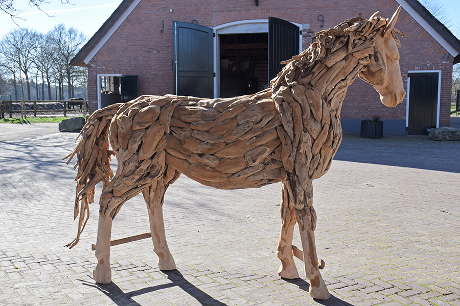 Dit enorme houten paard is gemaakt van stukken drijfhout en staat er levensecht bij. Met een hoogte van 220 cm en een lengte van 260 cm is het een indrukwekkend kunstwerk. Vraagprijs: €1.990