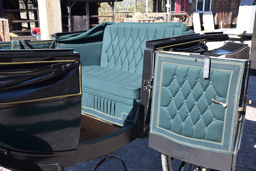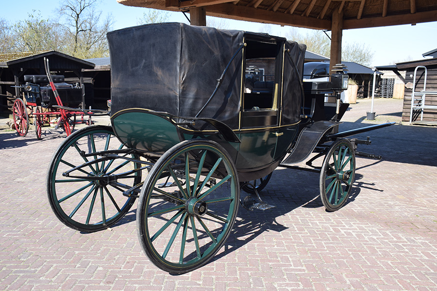 In zeer goede staat verkerende groene landauer met groen lederen bekleding. Bijzonder fraai exemplaar waarvan de groen lederen kap eenvoudig is te openen en sluiten. Een heuse cabrio onder de rijtuigen. Geschikt voor een dubbelspan en wordt geleverd inclusief langboom. Vraagprijs: € 8.800,-