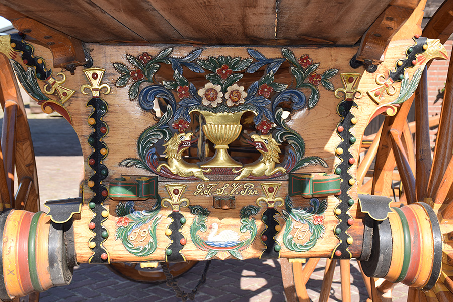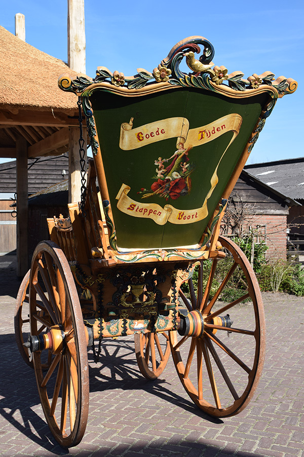 Deze bijzonder fraaie en rijkelijk versierde oogstwagen is niet te koop, maar willen we graag laten zien. Het is de laatste oogstwagen die in Nederland in 1971 is gebouwd door de firma Peek uit Meerkerk. Een waar pronkstuk uit onze collectie.