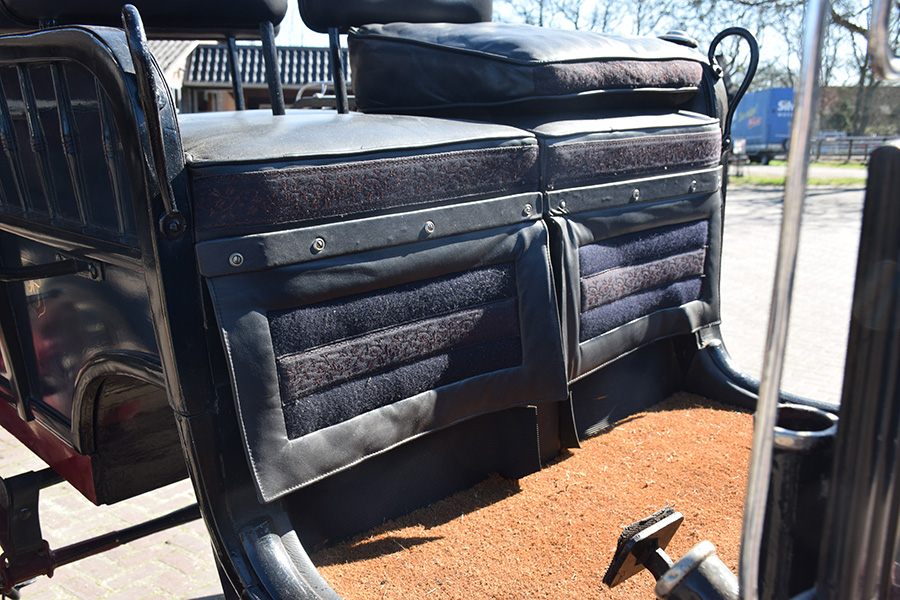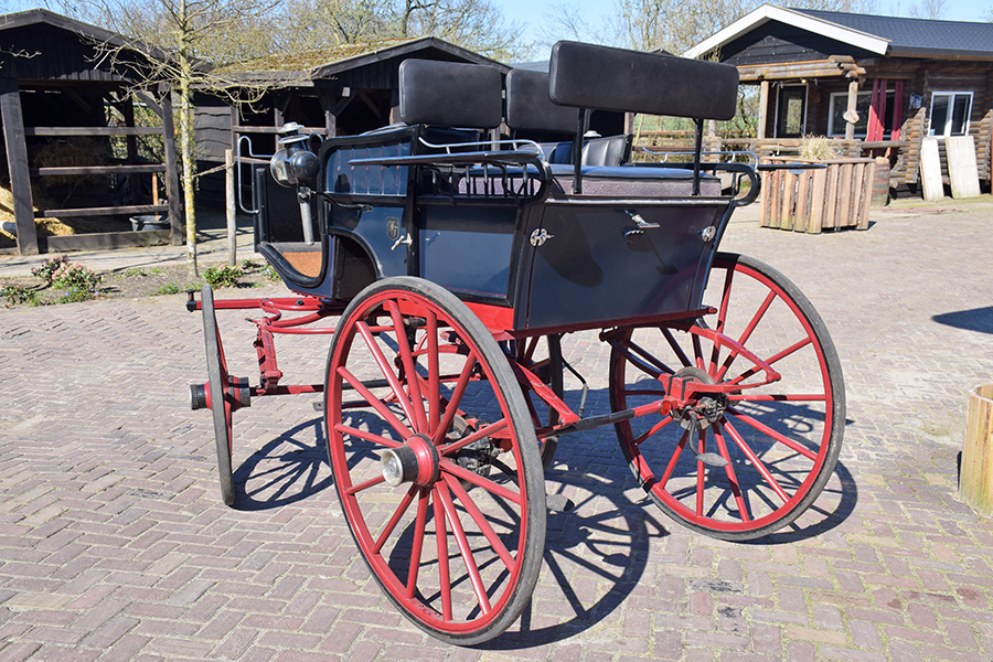 In zeer goede staat verkerende rood/blauwe wagonette met zwart lederen bekleding. Zowel geschikt voor enkelspan als dubbelspan, inclusief langboom. Vraagprijs: € 2.200,-